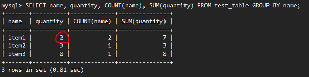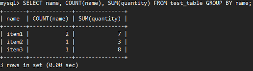 # SELECT name, quantity, COUNT(name), SUM(quantity) FROM test_table GROUP BY name;