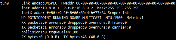정상적으로 실행되었다면 tun0 라는 이름의 네트워크 인터페이스가 생성된다.
