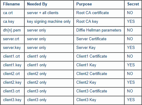 $ ls keys/ 01.pem ca.key client01.key index.txt.attr serial server.csr 02.pem client01.crt dh2048.pem index.txt.attr.old serial.old server.key ca.crt client01.csr index.txt index.txt.old server.crt