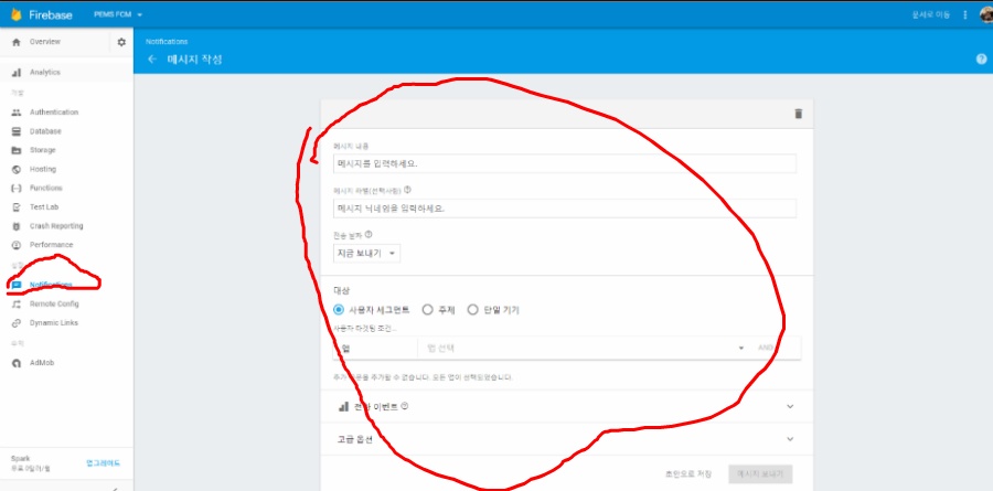 저 파이어베이스 콘솔에서 빨간동그라미 누르고 프로젝트 설정의 클라우드 메세징으로 가면