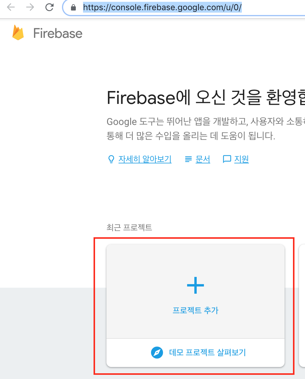 파이어 베이스 콘솔 페이지에 접속해서 프로젝트를 추가해 봅니다.
