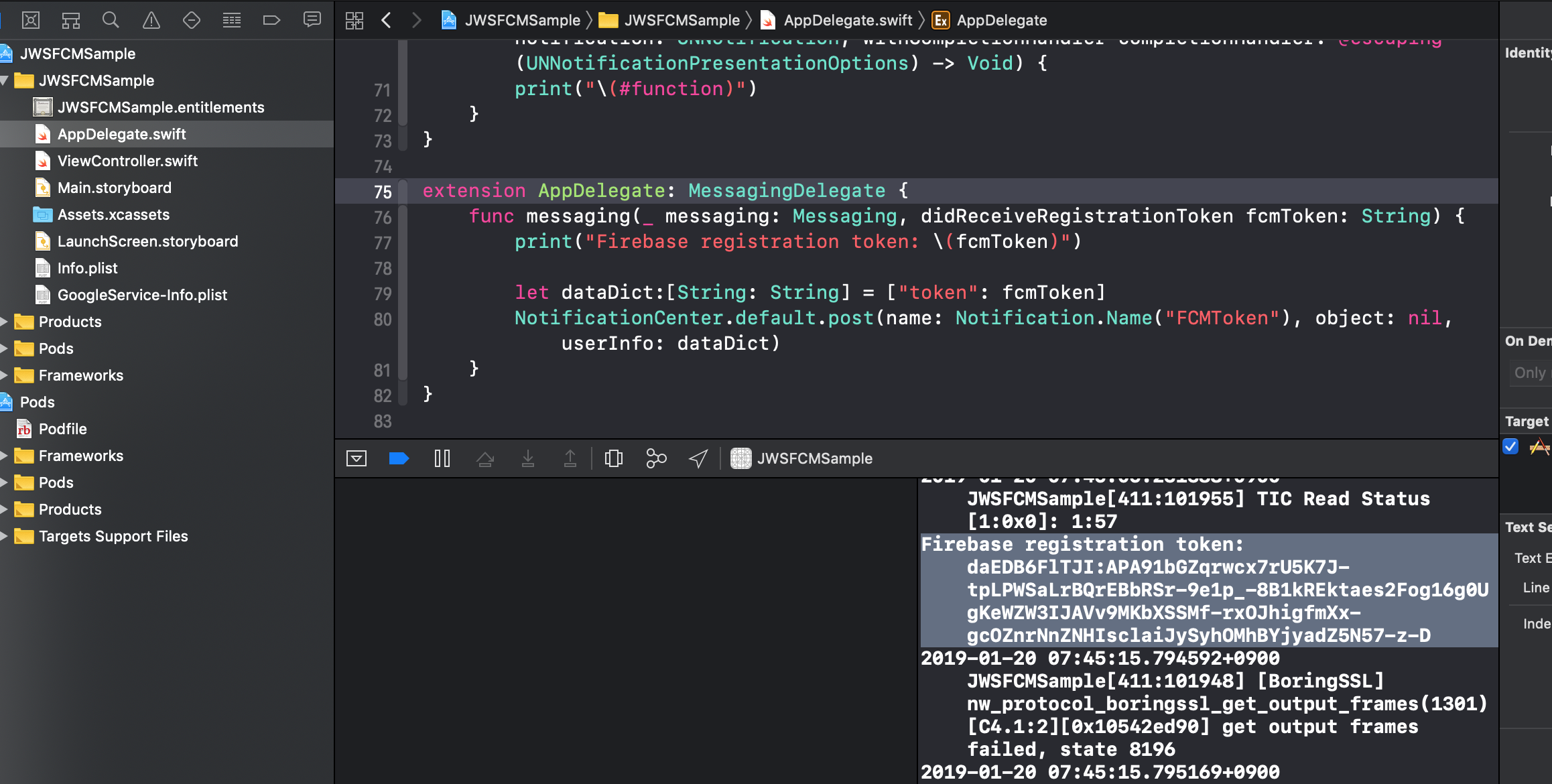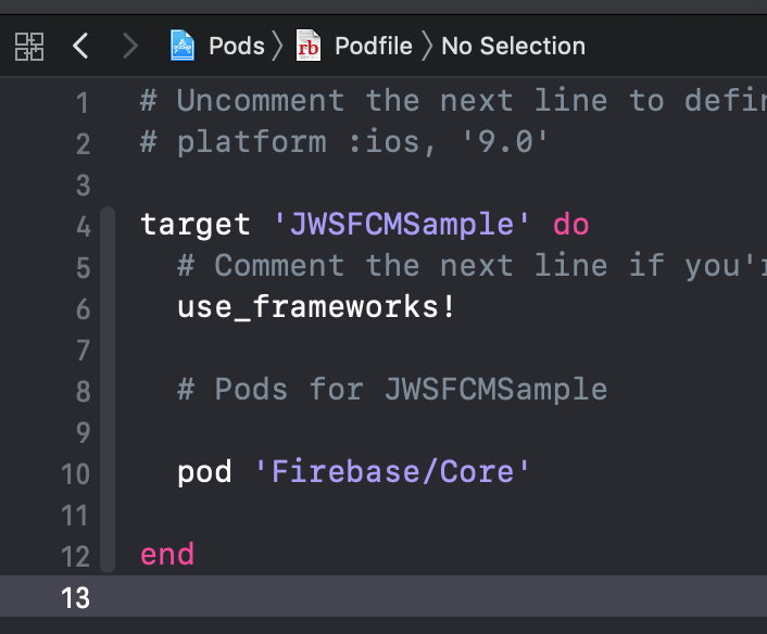 target 'JWSFCMSample' do# Comment the next line if you're not using Swift and don't want to use dynamic frameworksuse_frameworks!# Pods for JWSFCMSamplepod 'Firebase/Core'pod 'Firebase/Messaging'end