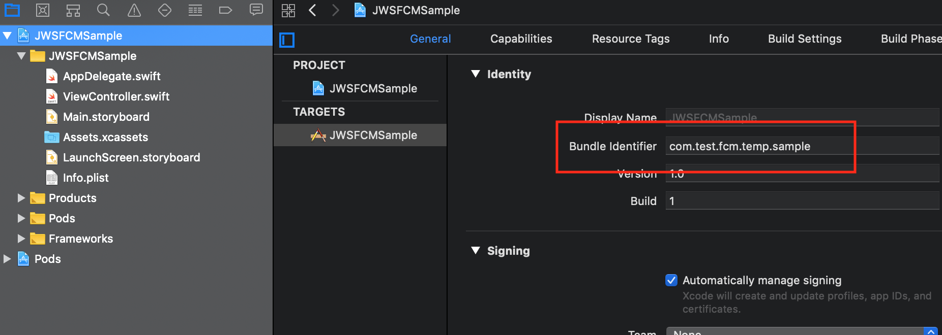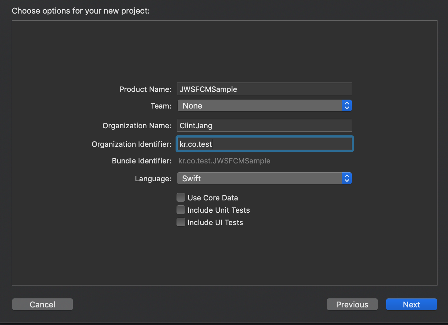저는 프로젝트 명을 ‘JWSFCMSample’ 으로 만들었습니다.