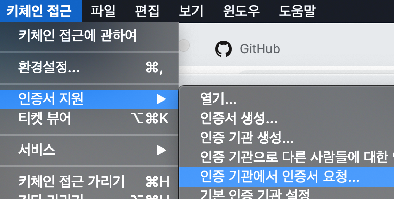 그리고 왼쪽 상단 메뉴에서 ‘인증기관에서 인증서 요청…’ 을 클릭합니다.