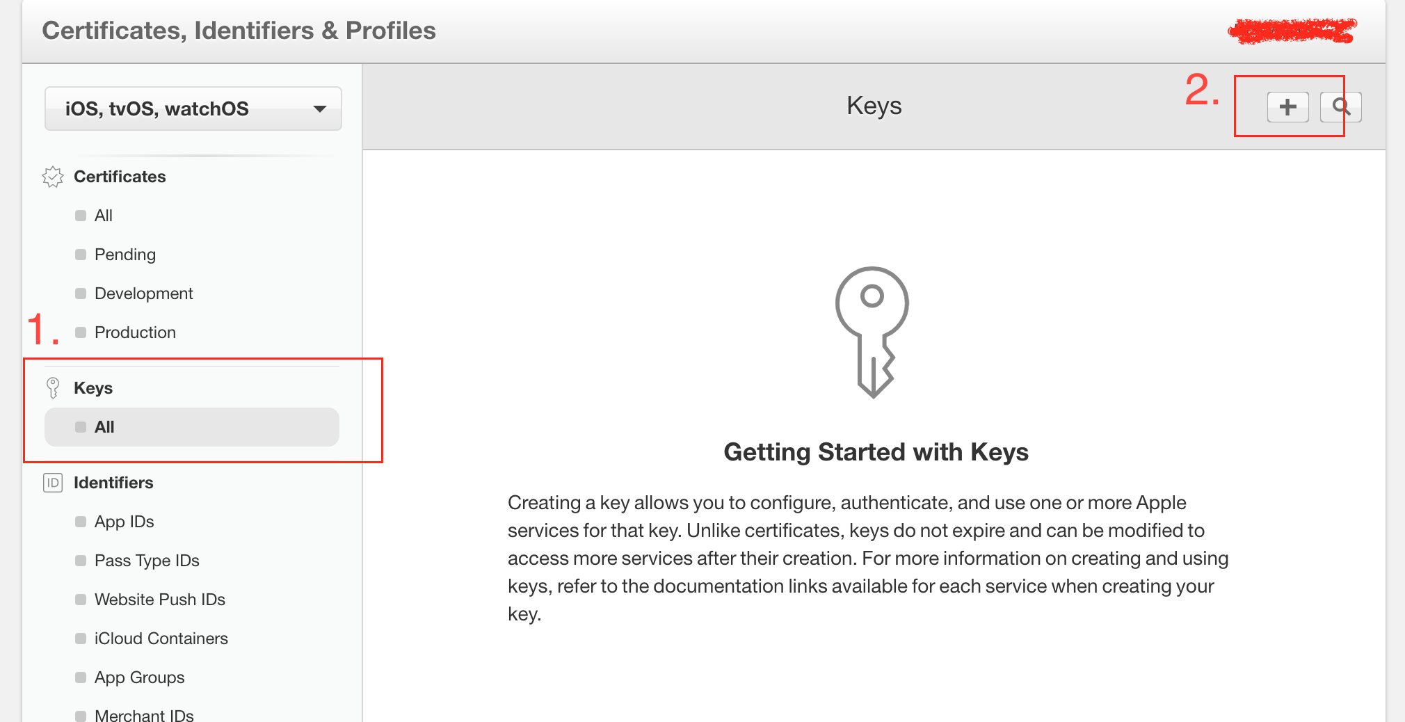 - 그리고 2. ‘+’ 버튼을 눌러 Key 생성을 진행합니다.