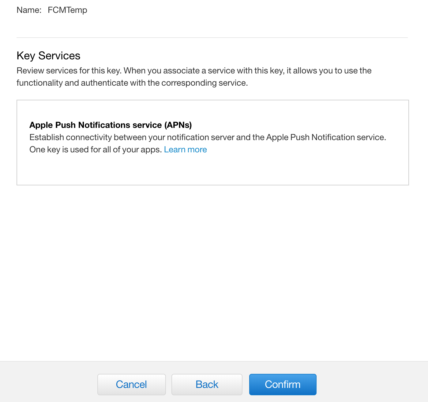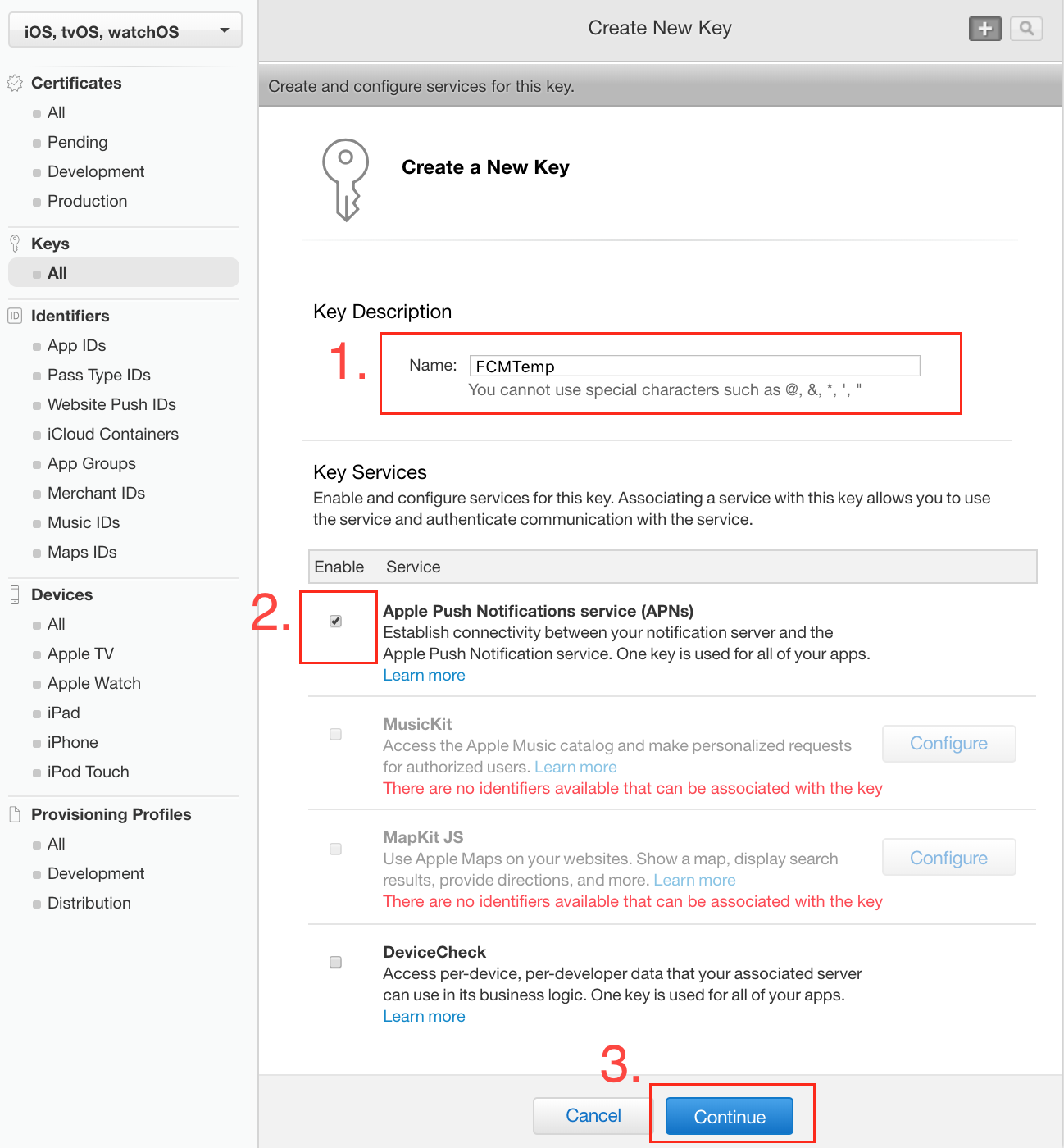 Key Services(키 서비스)에서 APN 체크박스를 선택하고 계속을 클릭합니다.