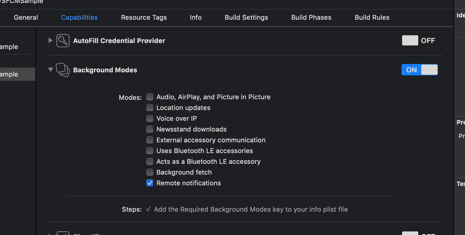 iOS Sample Project => Capabilitles에서 Push Notification, Background Modes 설정을 해줍니다.