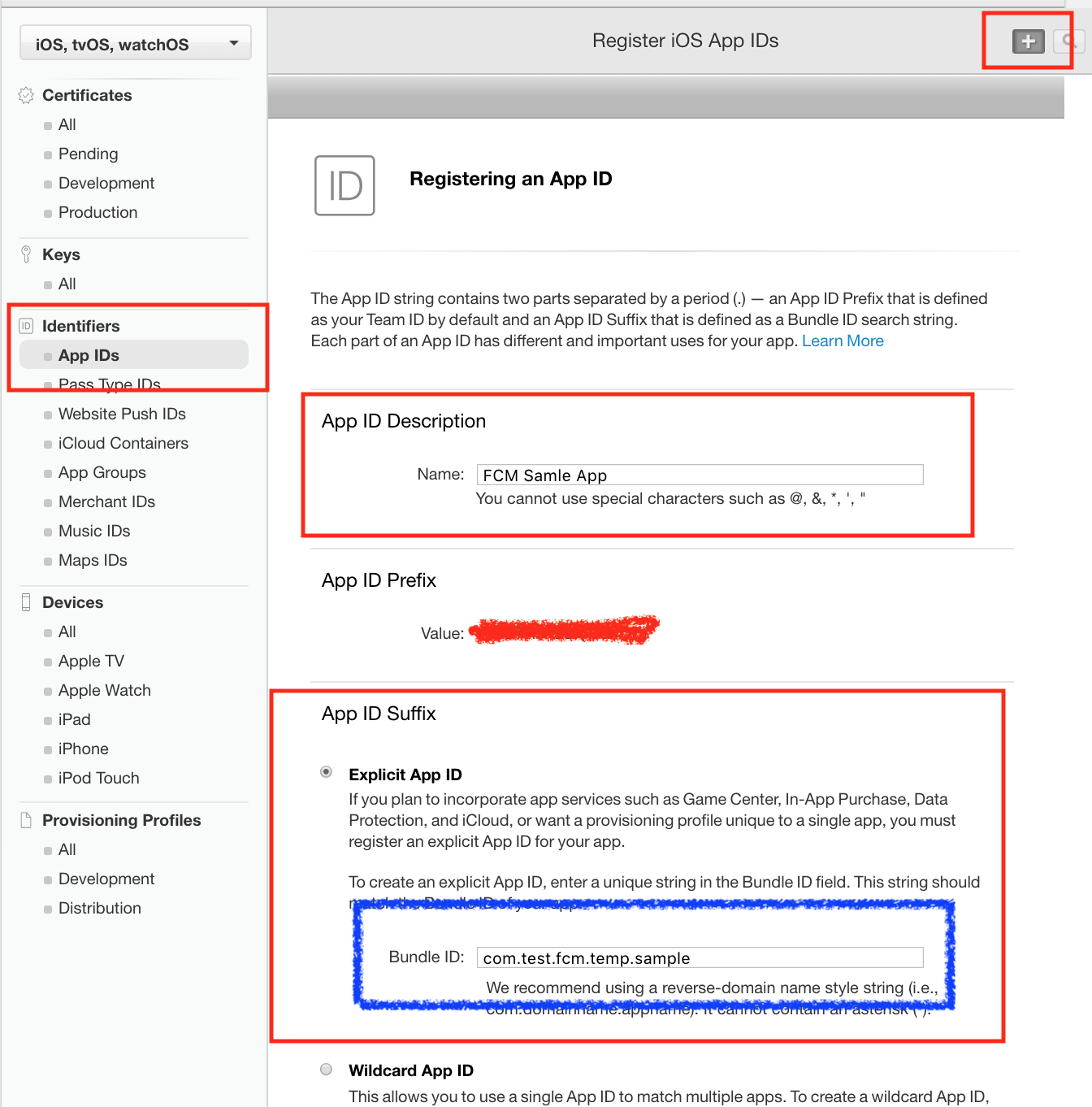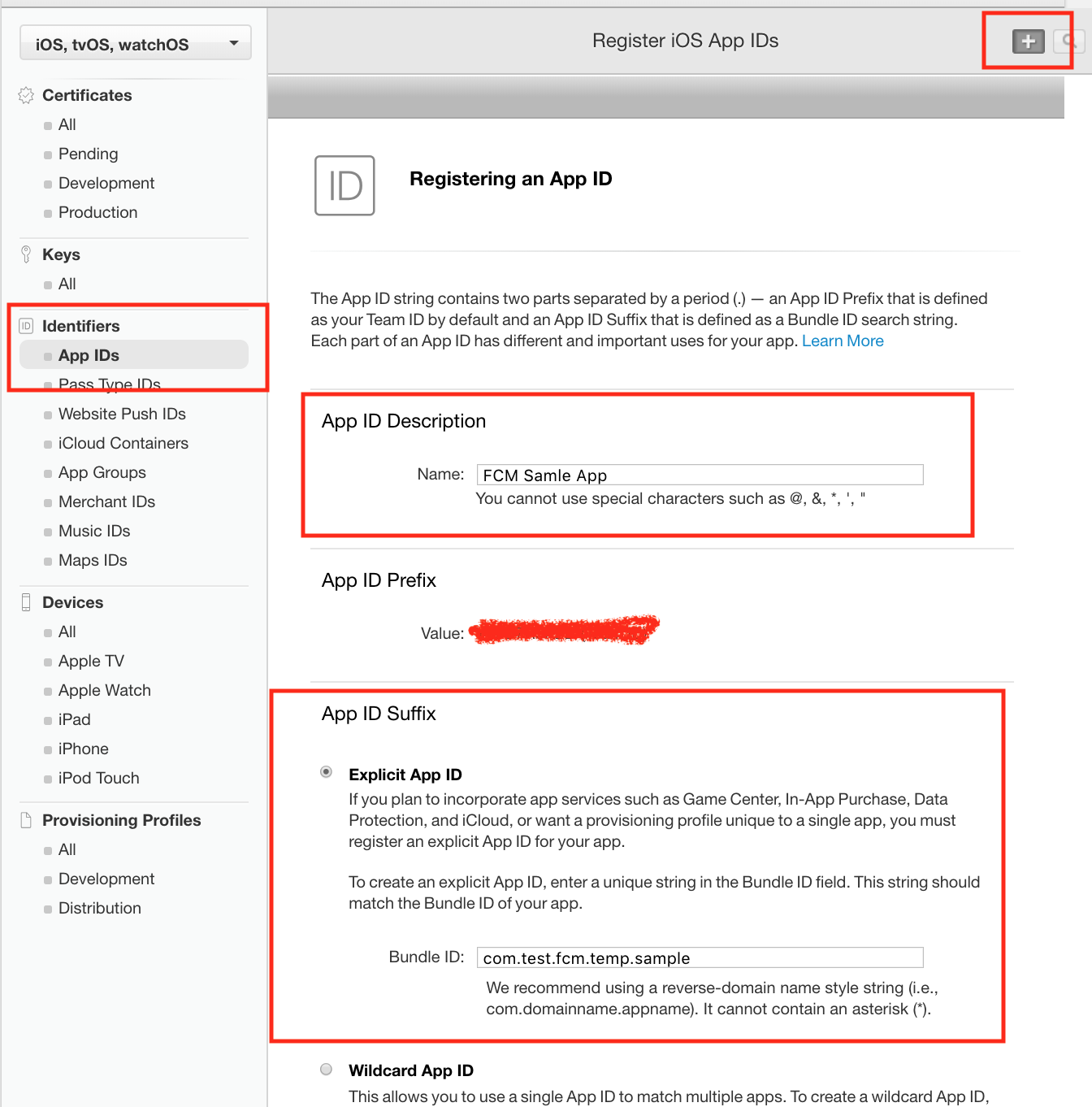 - + 버튼을 클릭하여 새로운 앱 ID를 만듭니다.