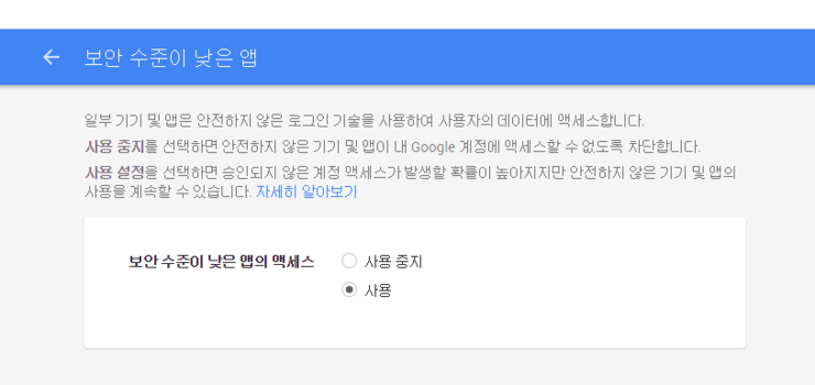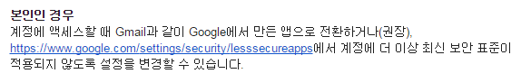 여전히 오류 메시지가 뜰 때에, 그리고 그 내용이 계정에 대해 접근을 못했다고 했을 때에는 지메일의 아이디 설정을 해줘야 합니다.