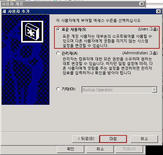 생성한 사용자계정의 패스워드를 입력후 새 사용자 추가 부분의세 '표준 사용자'를 선택하여 마침을 눌러계정생성을 완료합니다.