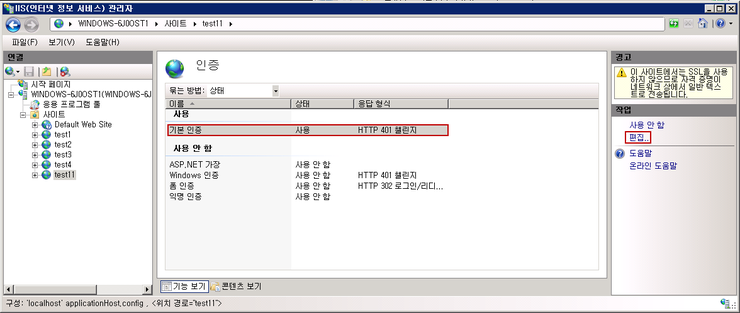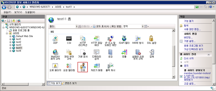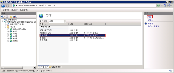 이제 IIS 기본인증을 세팅을 진행해보도록 하겠습니다