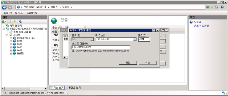 IIS 바인딩에서 기본인증할 웹사이트에서 기본인증을 할 포트를 9999포트로 변경합니다