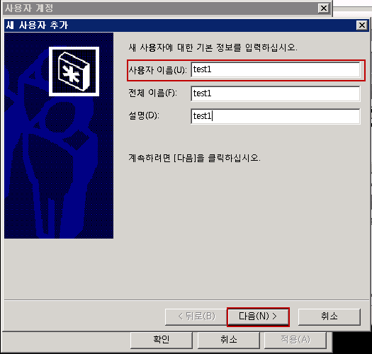 이제 Windows의 기본인증의 필요한 설치가 완료되으니 Window 기본인증으로 로그인할 계정이 생성하는 과정이 필요합니다.