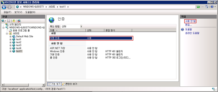 익명인증 : IIS 웹서비스 사용자가 모두 들어갈수 있게 설정하는 과정입니다 이부분이 사용이 설정이되면 Windows 인증을 사용할 수 없습니다