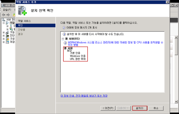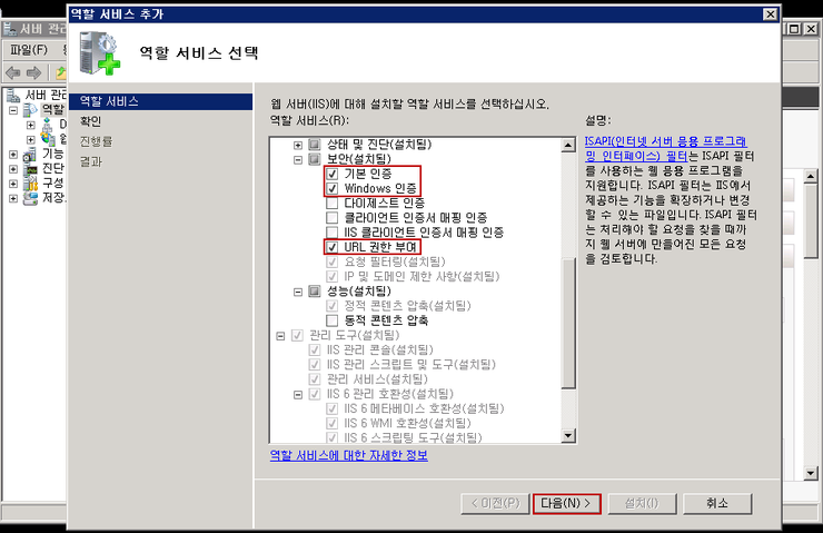 Windows 기본인증에 필요한 역할 서비스를 확인후 설치를 진행하시면 됩니다.