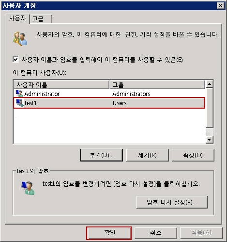 생성한 test1 계정을 확인되며, Windows 기본인증의 로그인할 계정입니다.