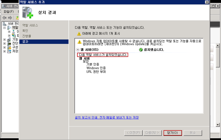 이제 역할 서비스가 설치가 모두 완료 되었습니다.