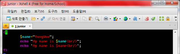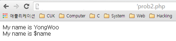 <? $name="YongWoo"; echo "My name is $name<br/>"; echo 'My name is $name<br/>'; ?>