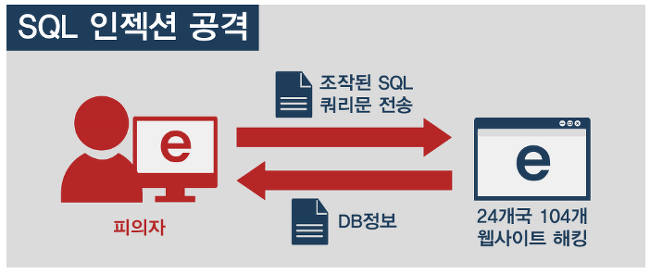 - 서버에 특정 SQL문을 입력하여 데이터베이스에 접근, 회원정보 등을 유출할 수 있는 공격
