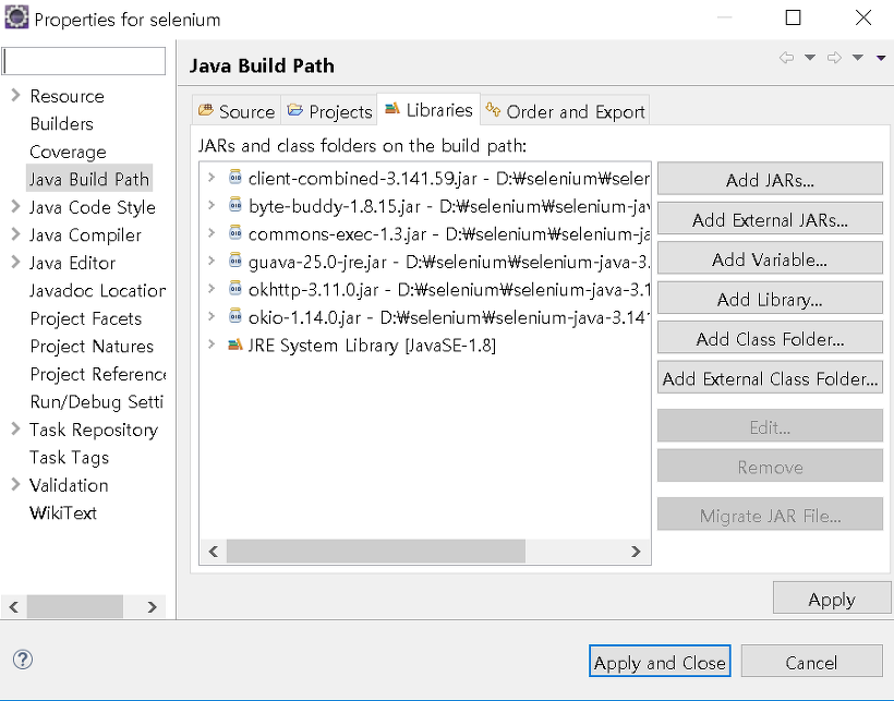 selenium 프로젝트를 클릭하고 마우스를 우클릭 - Properties - Java Build Path - Add External JARs..