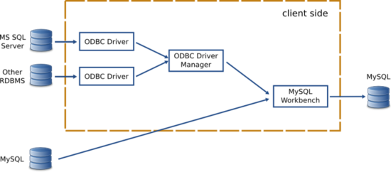 MySQL Workbench의 Migration Wizard 기능을 다이어그램으로 설명합니다.