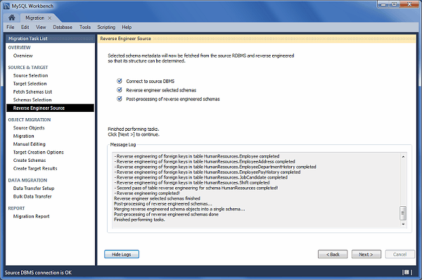 The source metadata is fetched from the source RDBMS, and reverse engineered. This is an automated and informational step that reports related errors and/or general log information. View the logs and then press Next to continue.