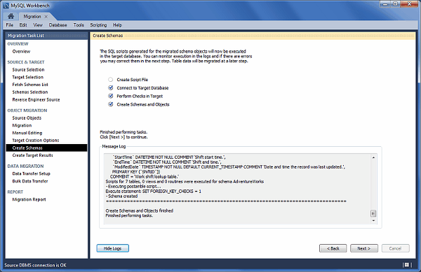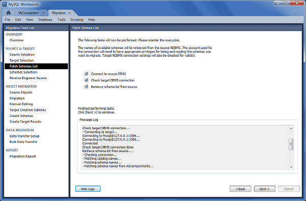 The Schemas list is retrieved from both the source and target RDBMS. This is an automated and informational step that reports connection related errors and/or general log information. press Next to continue.