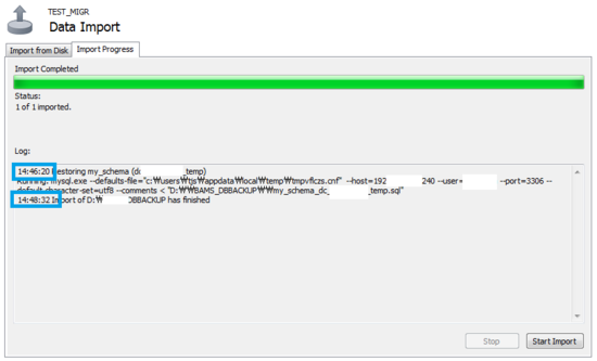 그러나 속도를 보면 MySQL Workbench의 Migration Wizard가 Data Export/Import를 수행한 것보다 거의 세배 정도 늦습니다. 다음은 Data Export / Import를 순차적으로 실행한 화면입니다.