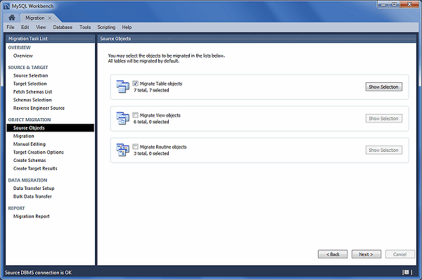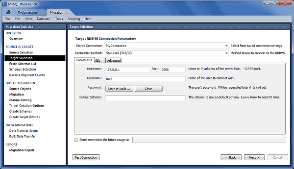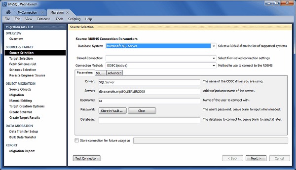 10.4 MySQL Workbench migration: Source Selection (Parameters)