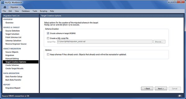 - Create a shell script to use native server dump and load abilities for fast migration: Unlike the simple batch file that performs a live online copy, this generates a script to be executed on the source host to then generate a Zip file containing all of the data and information needed to migrate the data locally on the target host. Copy and extract the generated Zip file on the target host and then execute the import script (on the target host) to import the data into MySQL using a LOAD DATA call.