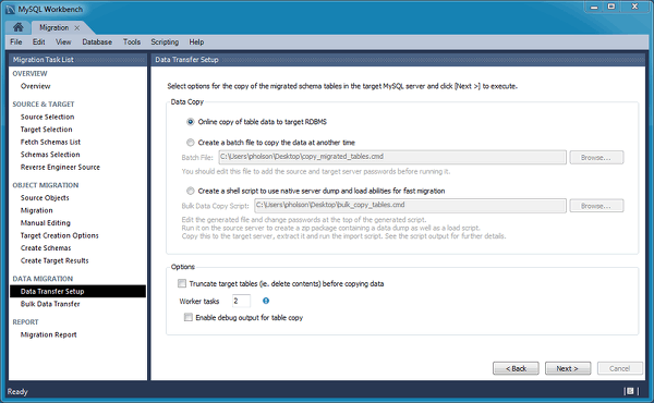 - Create a batch file to copy the data at another time: The data may also be dumped to a file that can be executed at a later time, or be used as a backup. This script uses a MySQL connection to transfer the data.