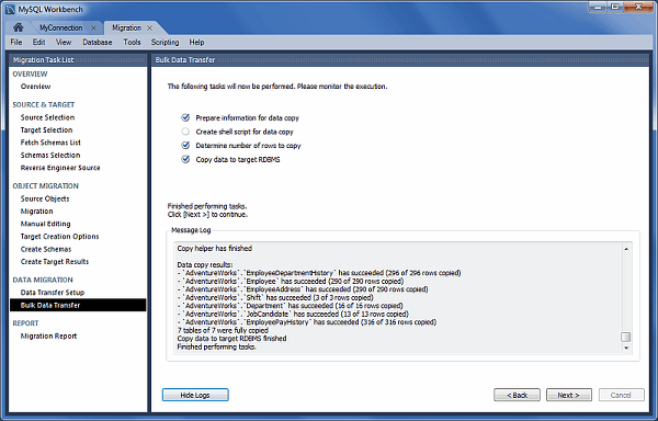 Depending on the selected option, this will either transfer the data to the target RDBMS (default), generate a simple script for the online data transfer, or generate script to execute on the source host that then generates a Zip file containing both the transfer script and data that will be executed on the target host. Optionally, view the logs to confirm.
