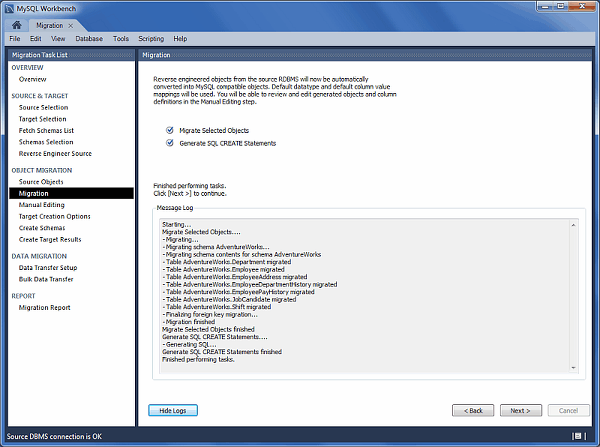 The migration process now converts the selected objects into MySQL compatible objects. view the logs and then proceed.
