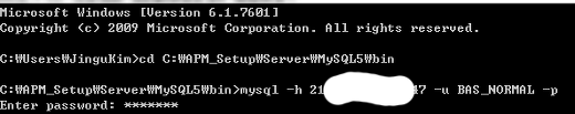 ex ) mysql -h 211.186.123.321 -u BAS_NORMAL -p
