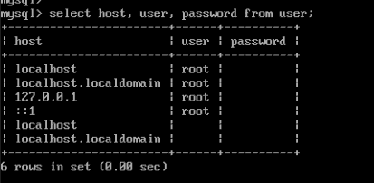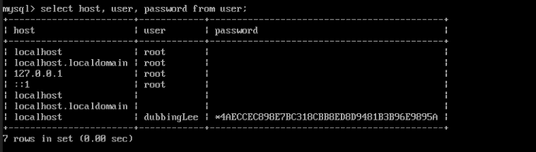 select host, user, password from user; 를 입력하여