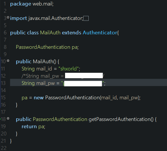 이제 부여받은 비밀번호를 SMTP 서버에 인증하는 소스코드 부분에 입력한다.