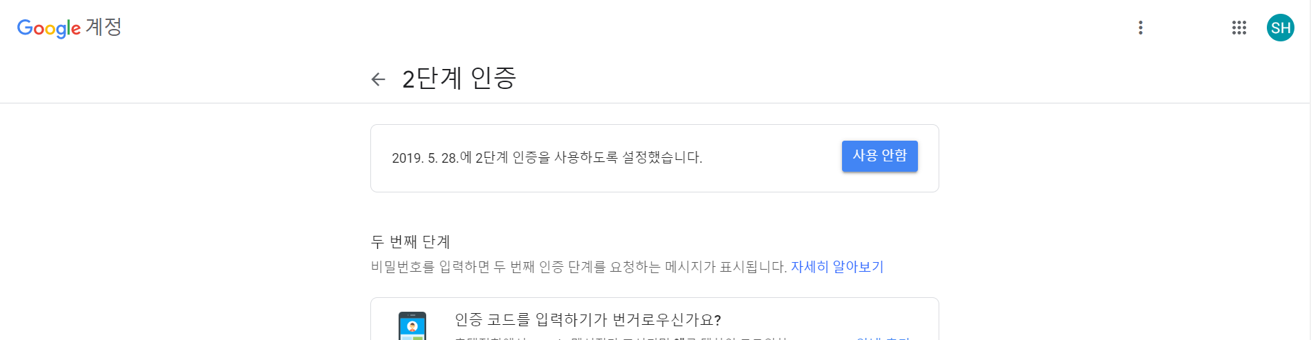 핸드폰 인증이 끝나면 위와 같이 2단계 인증을 사용할 수 있게 된다.