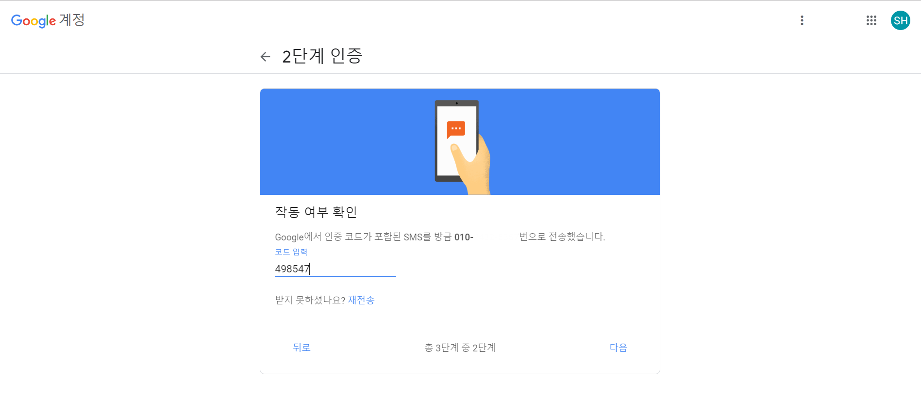 2단계 인증에 앞서 핸드폰 인증을 하게 된다.