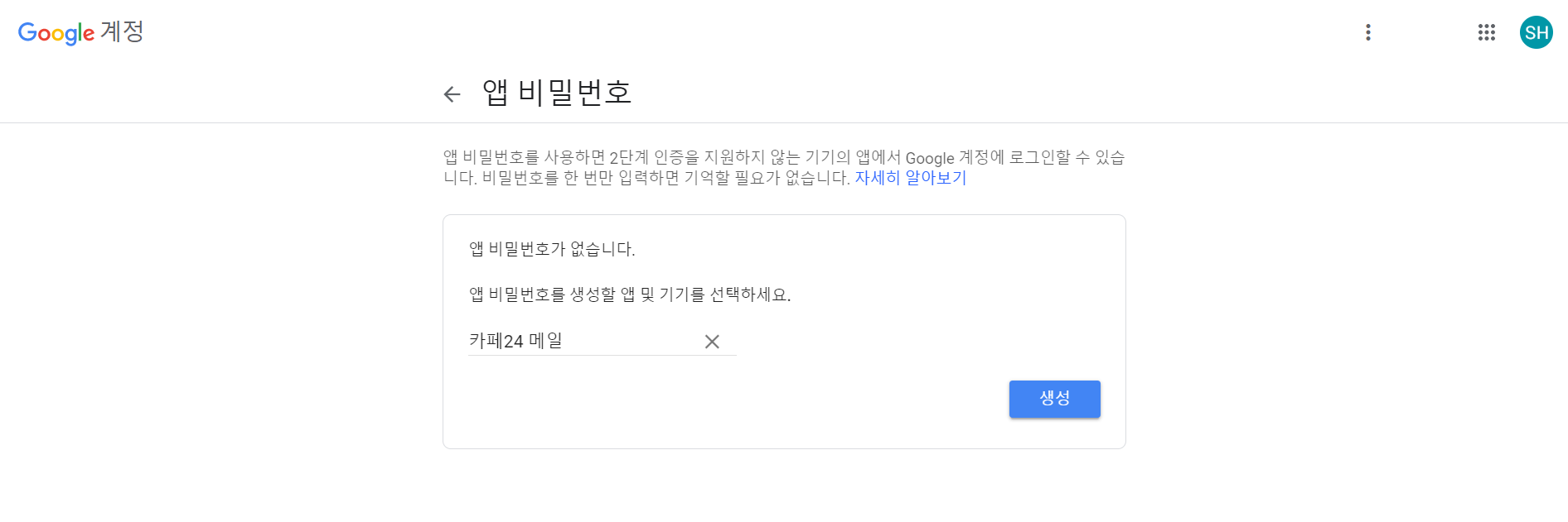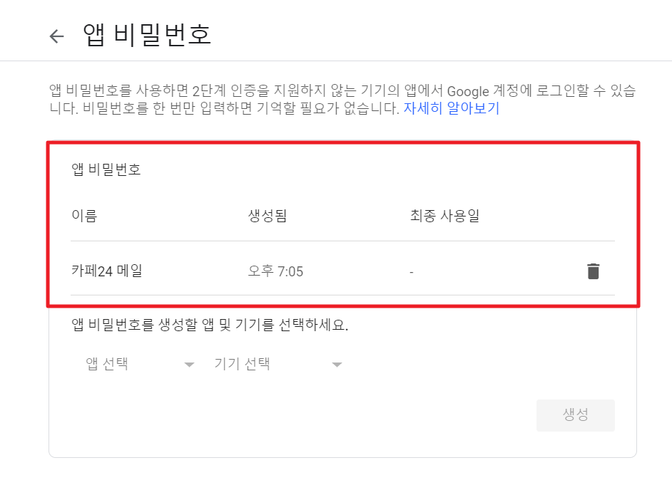 6) 생성이 완료되면 기기용 앱 비밀번호를 부여받는다.