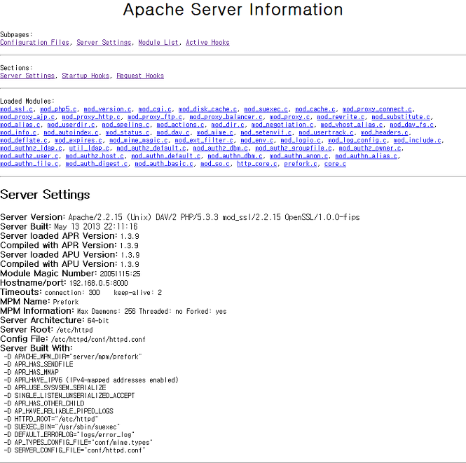 mod_info 모듈을 사용하여 서버의 설정상태들을 보고 받을 수 있다. 실행방법은 http://도메인/server-info 와 같다. 관리자만이 접속할 수 있도록 서버와 같은 로컬 네트워크에서만 접속할 수 있게 설정했다.