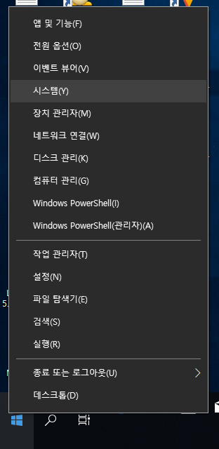 시작버튼에서 오른쪽 마우스를 클릭하거나, [ 윈도우키 + X ] 를 선택하면 나오는 메뉴에서 시스템 메뉴를 선택합니다.