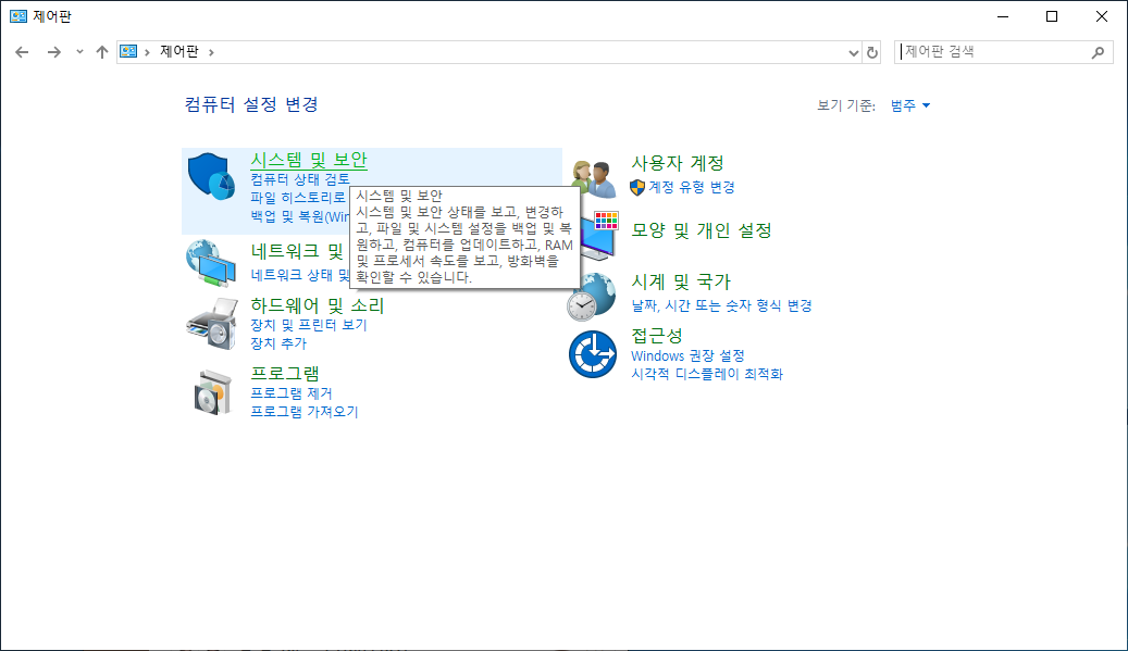 제어판에 접속한뒤, 시스템 및 보안 메뉴를 클릭합니다.