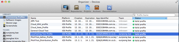 1. 이전 포스팅에서 다운로드받아 놓은 프로비저닝 프로파일을 더블클릭해서 xcode Organizer에 등록합니다.