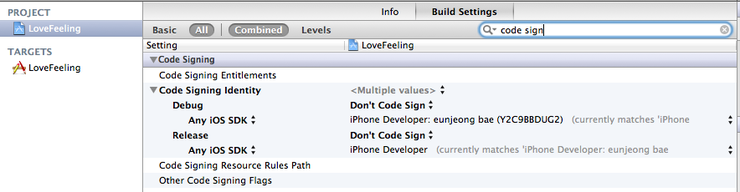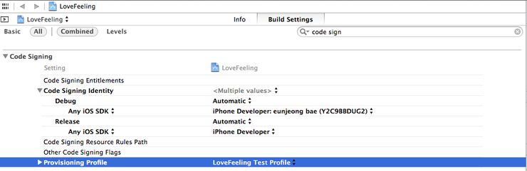 2. 프로비저닝 프로파일을 만들 때 사용한 App ID에 맞게 프로젝트를 생성한 후, 생성한 프로비저닝 프로파일로 Code Sign을 해줍니다.