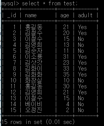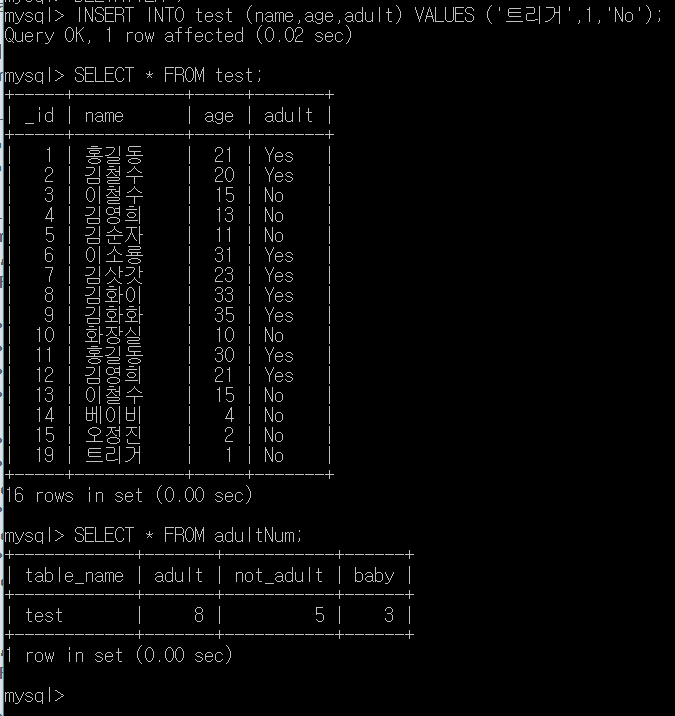INSERT INTO test (name,age,adult) VALUES (‘트리거’,1,’No’);