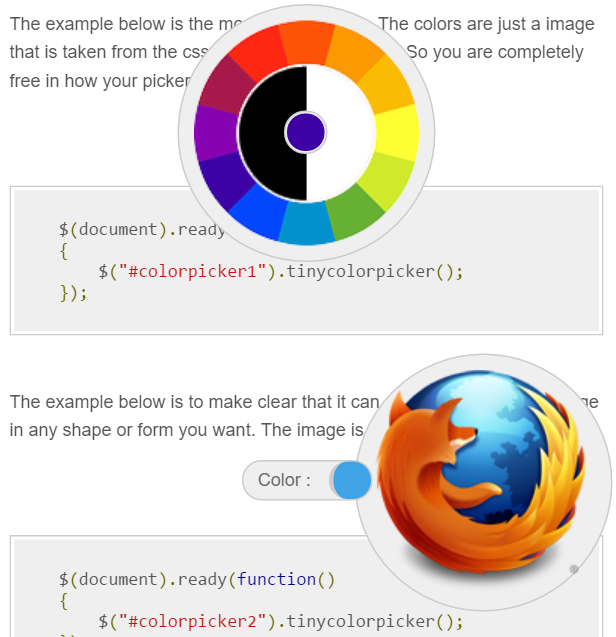 The Wheel Color Picker plugin adds color picker functionality to HTML element in round color wheel style. The Wheel Color Picker can be displayed as a popup dialog as users focus the input, or embedded inline.