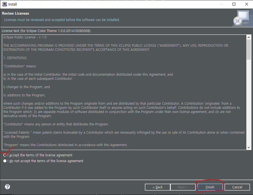I accept the terms of the license agreement 에 체크를 해준 뒤 Finish 를 눌러줍니다.