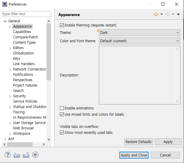 이클립스를 재실행 해준 뒤 다시 Window -> Preference 에 들어가서 General - Appearance