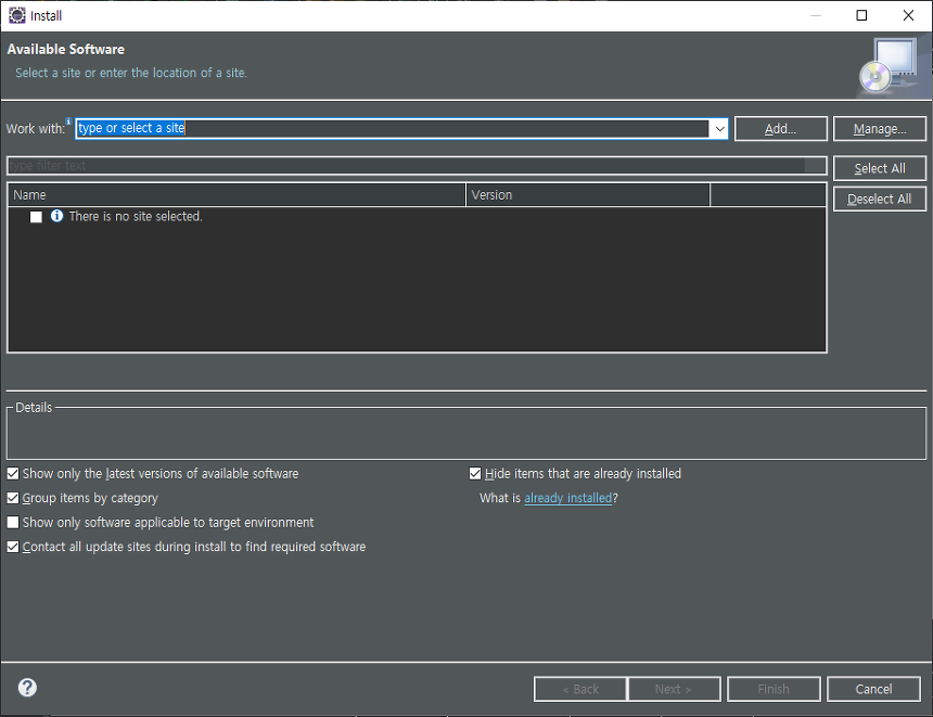 이클립스 상단 메뉴의 Help 에 Install New Software.. 를 실행시켜줍니다.