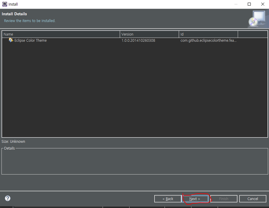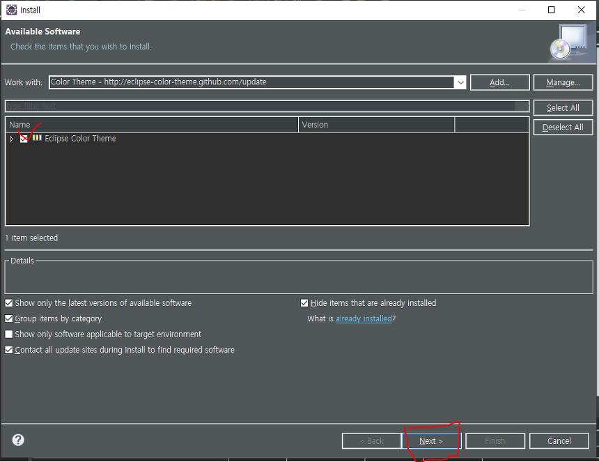 새로 생긴 Eclipse Color Theme 에 체크를 해준 뒤 Next> 를 눌러줍니다.